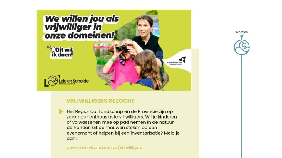 Het Regionaal Landschap en de Provincie zijn op zoek naar enthousiaste vrijwilligers. Wil je kinderen of volwassenen mee op pad nemen in de natuur, de handen uit de mouwen steken op een evenement of helpen bij een inventarisatie? Meld je aan!
