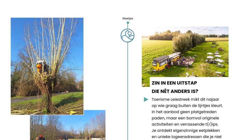 Toerisme Leiestreek mikt dit najaar op wie graag buiten de lijntjes kleurt. In het aanbod geen platgetreden paden, maar een bomvol originele activiteiten en verrassende t(r)ips. Je ontdekt eigenzinnige eetplekken en unieke logeeradressen die je niet snel vergeet. Perfect voor een uitstap met een hoek af.