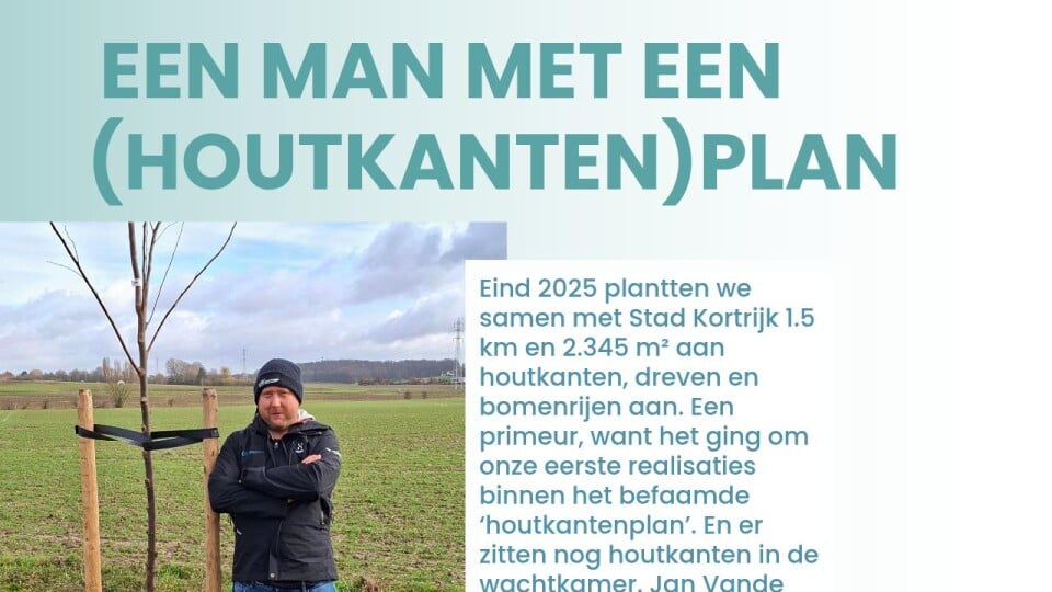 Eind 2025 plantten we samen met Stad Kortrijk 1.5 km en 2.345 m² aan houtkanten, dreven en bomenrijen aan. Een primeur, want het ging om onze eerste realisaties binnen het befaamde ‘houtkantenplan’. En er zitten nog houtkanten in de wachtkamer. Jan Vande Walle, bomenplanner en houtkantenfanaat van het eerste uur, geeft tekst en uitleg.