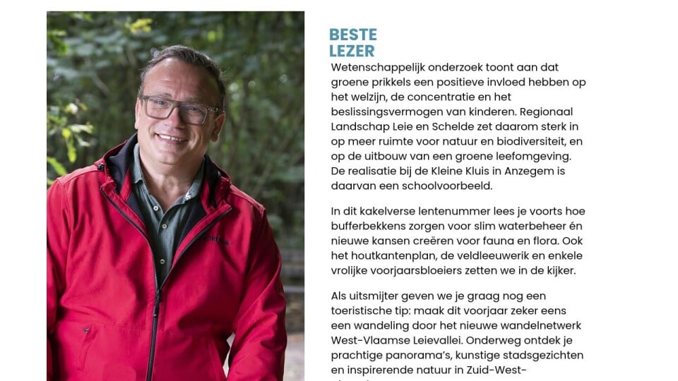 In dit kakelverse lentenummer lees je voorts hoe bufferbekkens zorgen voor slim waterbeheer én nieuwe kansen creëren voor fauna en flora. Ook het houtkantenplan, de veldleeuwerik en enkele vrolijke voorjaarsbloeiers zetten we in de kijker.