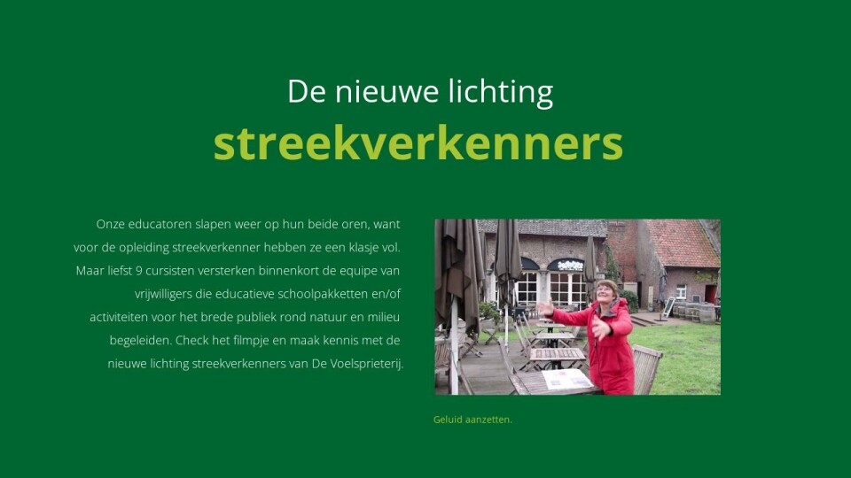 Onze educatoren slapen weer op hun beide oren, want voor de opleiding streekverkenner hebben ze een klasje vol. Maar liefst 9 cursisten versterken binnenkort de equipe van vrijwilligers die educatieve schoolpakketten en/of activiteiten voor het brede publiek rond natuur en milieu begeleiden. Check het filmpje en maak kennis met de nieuwe lichting streekverkenners van De Voelsprieterij.